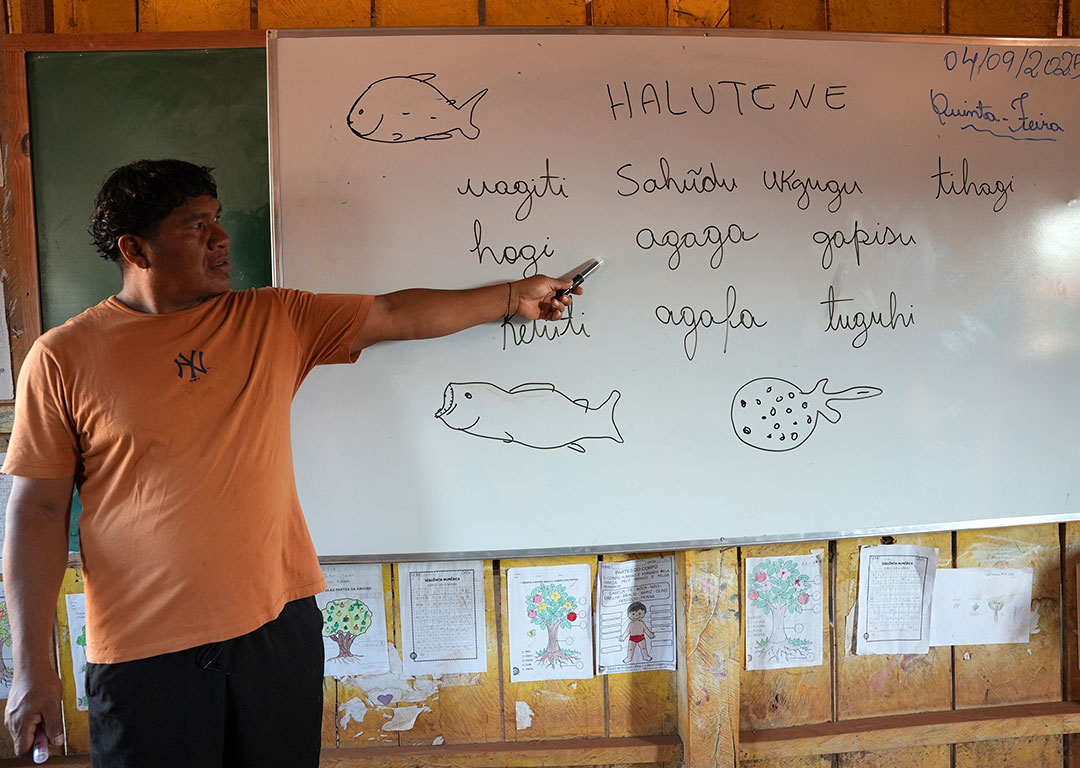 Do outro lado da sala de aula, no entanto, falta apoio e insumo para os professores. Sem materiais didáticos pensados para os povos indígenas, eles precisam reinventar os métodos de ensino.