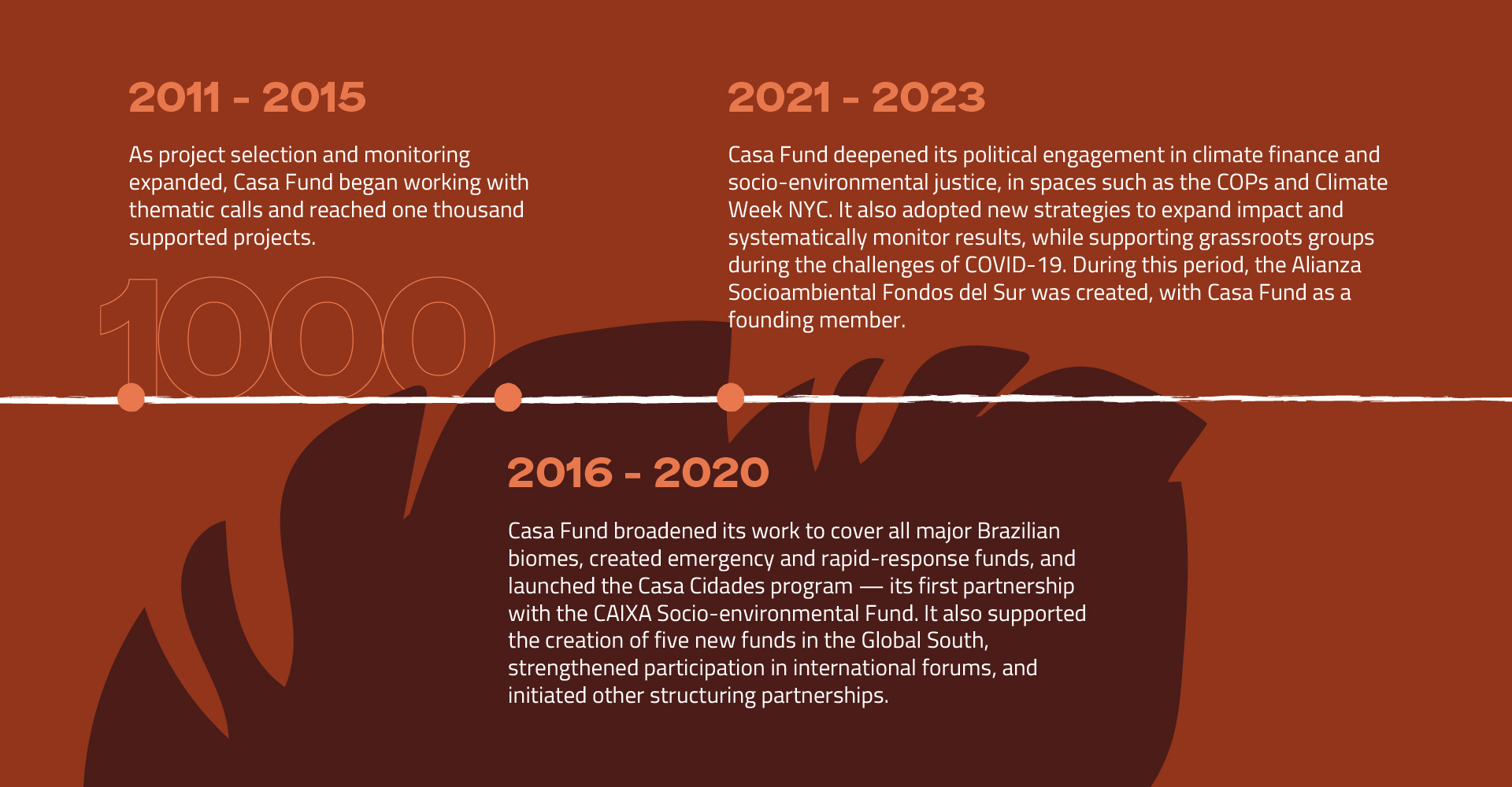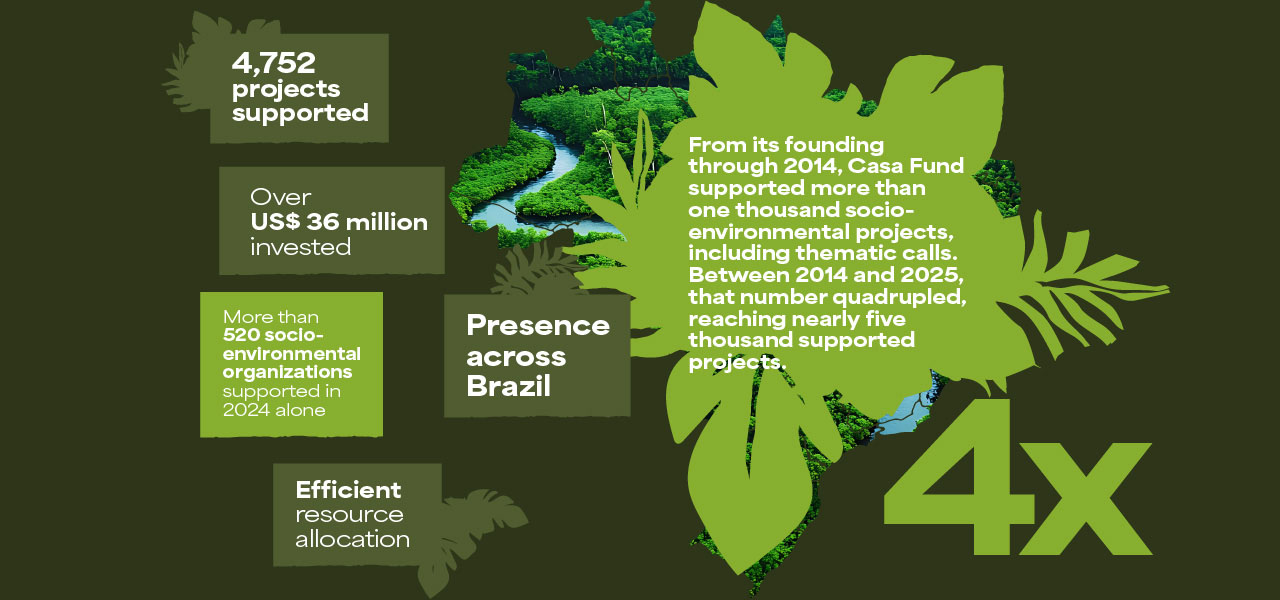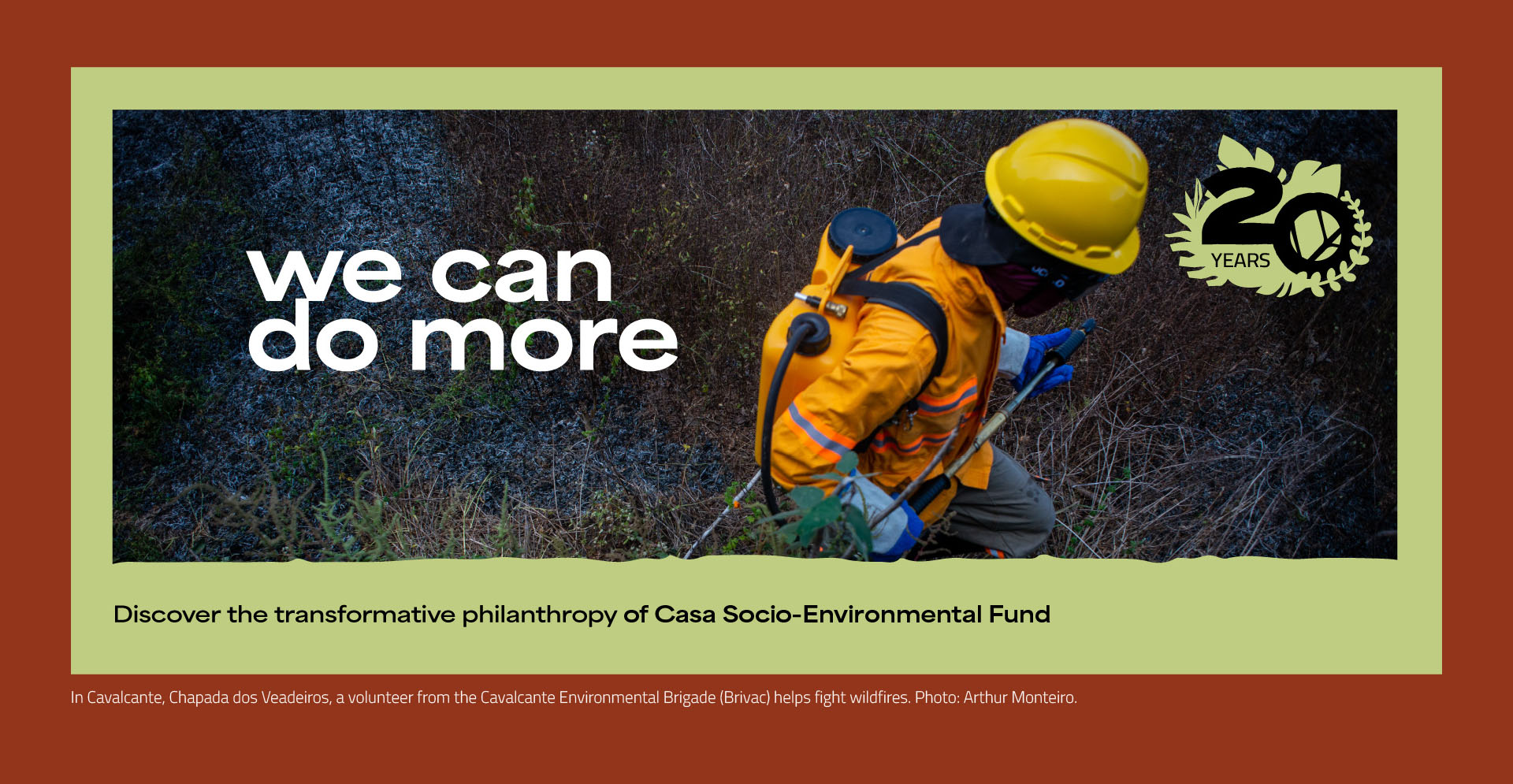 Read moreThe Casa Socio-Environmental Fund in an organization seeking to promote environmental conservation and sustainability, democracy, respect for socio-environmental rights and social justice through financial support to civil society initiatives and by strengthening their capacities in South America. We have pioneered the debate on socio-environmental philanthropy in Brazil since 2005. Our mission is to generate positive impact on diverse territories, investing in the lives of those who care for them, and establishing connections between communities and organizations. We exist to generate change.